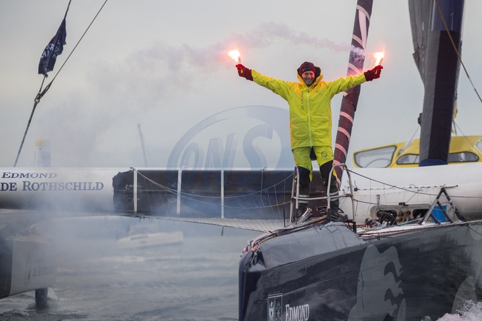 Charles Caudrelier (Maxi Edmond de Rothschild), vainqueur de l'Arkéa Ultim Challenge (50 jours, 19 heures, 7 minutes et 42 secondes) à Brest