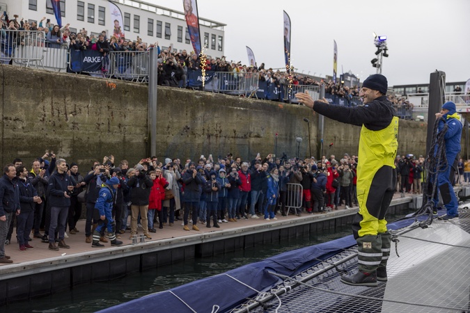 Charles Caudrelier (Maxi Edmond de Rothschild), vainqueur de l'Arkéa Ultim Challenge (50 jours, 19 heures, 7 minutes et 42 secondes) à Brest