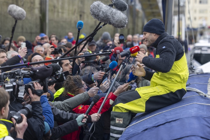 Charles Caudrelier (Maxi Edmond de Rothschild), vainqueur de l'Arkéa Ultim Challenge (50 jours, 19 heures, 7 minutes et 42 secondes) à Brest, le 27 février 2024. © Alexis Courcoux / Panoramic / Bestimage Charles Caudrelier (Maxi Edmond de Rothschild), winner of the Arkea Ultim Challenge (50 days, 19 hours, 7 minutes and 42 seconds) in Brest, February 27, 2024.