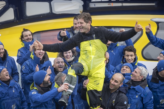 Charles Caudrelier (Maxi Edmond de Rothschild), vainqueur de l'Arkéa Ultim Challenge (50 jours, 19 heures, 7 minutes et 42 secondes) à Brest