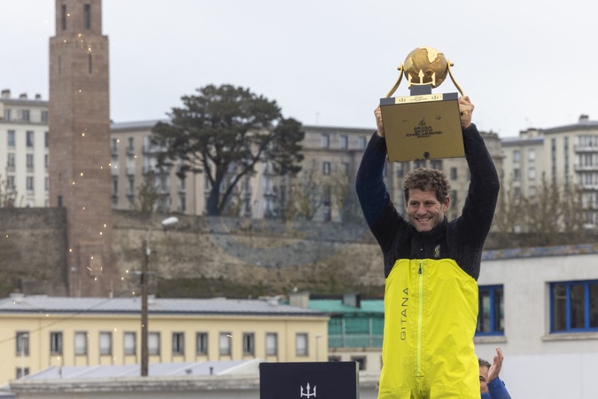 Charles Caudrelier (Maxi Edmond de Rothschild), vainqueur de l'Arkéa Ultim Challenge (50 jours, 19 heures, 7 minutes et 42 secondes) à Brest