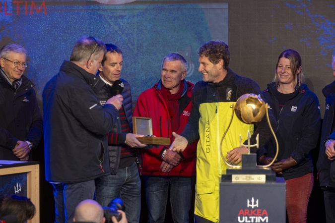 Charles Caudrelier (Maxi Edmond de Rothschild), vainqueur de l'Arkéa Ultim Challenge (50 jours, 19 heures, 7 minutes et 42 secondes) à Brest