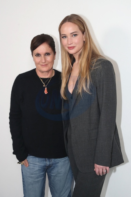 Maria Grazia Chiuri et Jennifer Lawrence posent backstage à la suite du Défilé de Mode Dior, Prêt-à-porter Automne / Hiver 2024-2025 dans le cadre de la Fashion Week de Paris, France, le 27 Fevrier 2024. © Bertrand Rindoff / Bestimage Greetings of the Dior Womenswear Fall / Winter 2024-2025 show as part of Paris Fashion Week on February 27, 2024 in Paris, France