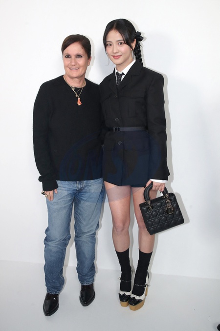 Maria Grazia Chiuri et Kim Ji-soo posent backstage à la suite du Défilé de Mode Dior, Prêt-à-porter Automne / Hiver 2024-2025 dans le cadre de la Fashion Week de Paris, France, le 27 Fevrier 2024. © Bertrand Rindoff / Bestimage Greetings of the Dior Womenswear Fall / Winter 2024-2025 show as part of Paris Fashion Week on February 27, 2024 in Paris, France