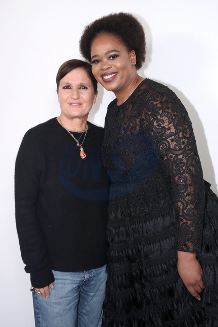 Maria Grazia Chiuri et Pretty Yende posent backstage à la suite du Défilé de Mode Dior, Prêt-à-porter Automne / Hiver 2024-2025 dans le cadre de la Fashion Week de Paris, France, le 27 Fevrier 2024. © Bertrand Rindoff / Bestimage Greetings of the Dior Womenswear Fall / Winter 2024-2025 show as part of Paris Fashion Week on February 27, 2024 in Paris, France