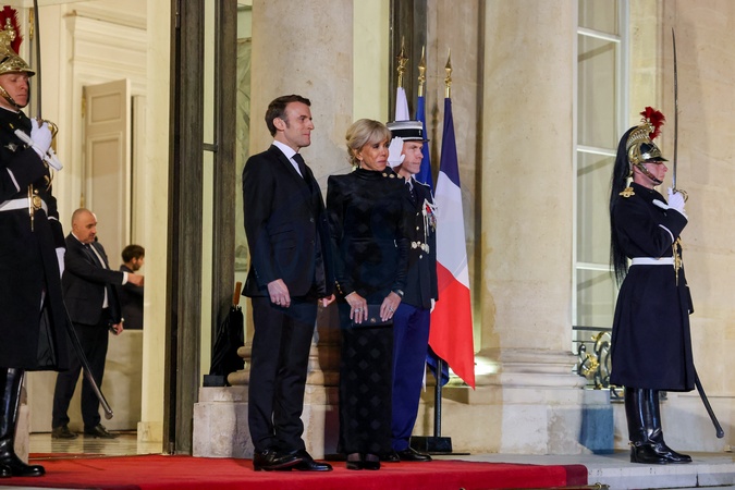 Le président de la République française Emmanuel Macron et sa femme la Première Dame Brigitte Macron accueillent l'Emir du Qatar pour un dîner d'Etat au palais présidentiel de l'Elysée à Paris, France, le 27 février 2024. © Dominique Jacovides/Bestimage French President Emmanuel Macron and his wife First Lady Brigitte Macron welcome the Emir of Qatar for a state dinner at the Elysée presidential palace in Paris, France, on February 27, 2024.
