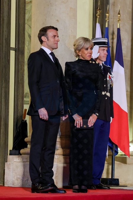 Le président de la République française Emmanuel Macron et sa femme la Première Dame Brigitte Macron accueillent l'Emir du Qatar pour un dîner d'Etat au palais présidentiel de l'Elysée à Paris, France, le 27 février 2024. © Dominique Jacovides/Bestimage French President Emmanuel Macron and his wife First Lady Brigitte Macron welcome the Emir of Qatar for a state dinner at the Elysée presidential palace in Paris, France, on February 27, 2024.