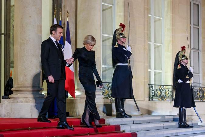 Le président de la République française Emmanuel Macron et sa femme la Première Dame Brigitte Macron accueillent l'Emir du Qatar pour un dîner d'Etat au palais présidentiel de l'Elysée à Paris, France, le 27 février 2024. © Dominique Jacovides/Bestimage French President Emmanuel Macron and his wife First Lady Brigitte Macron welcome the Emir of Qatar for a state dinner at the Elysée presidential palace in Paris, France, on February 27, 2024.