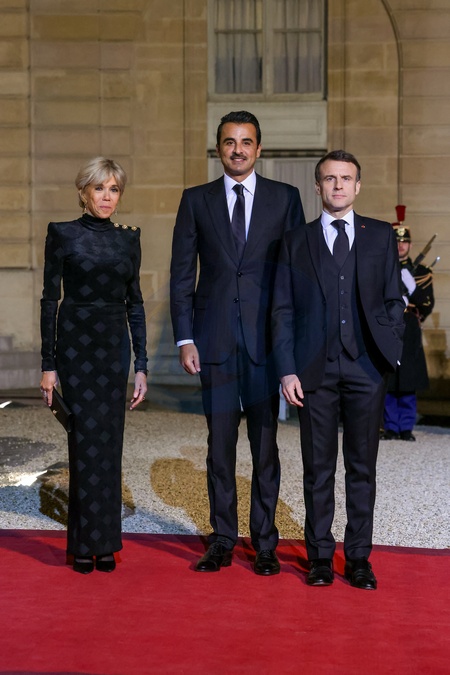 Le président de la République française Emmanuel Macron et sa femme la Première Dame Brigitte Macron accueillent l'Emir du Qatar son altesse Cheikh Tamim bin Hamad Al Thani pour un dîner d'Etat au palais présidentiel de l'Elysée à Paris, France, le 27 février 2024. © Dominique Jacovides/Bestimage French President Emmanuel Macron and his wife First Lady Brigitte Macron welcome the Emir of Qatar His Highness Sheikh Tamim bin Hamad Al Thani for a state dinner at the Elysée presidential palace in Paris, France, on February 27, 2024.