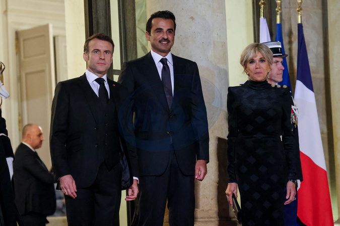 Le président de la République française Emmanuel Macron et sa femme la Première Dame Brigitte Macron accueillent l'Emir du Qatar son altesse Cheikh Tamim bin Hamad Al Thani pour un dîner d'Etat au palais présidentiel de l'Elysée à Paris, France, le 27 février 2024. © Dominique Jacovides/Bestimage French President Emmanuel Macron and his wife First Lady Brigitte Macron welcome the Emir of Qatar His Highness Sheikh Tamim bin Hamad Al Thani for a state dinner at the Elysée presidential palace in Paris, France, on February 27, 2024.