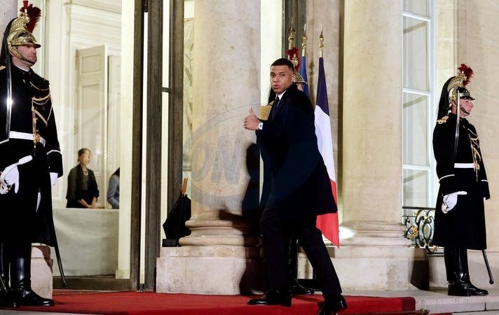 Kylian Mbappé - Arrivées au dîner d'état en l'honneur de l'Emir du Qatar au palais présidentiel de l'Elysée à Paris le 27 février 2024. © Dominique Jacovides / Bestimage Arrivals at official dinner on the sidelines of the state visit of Emir of Qatar at the Elysee Palace in Paris, France on February 27, 2024