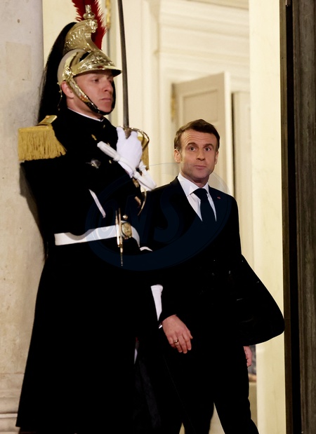 Le président Emmanuel Macron - Arrivées au dîner d'état en l'honneur de l'Emir du Qatar au palais présidentiel de l'Elysée à Paris le 27 février 2024. © Dominique Jacovides / Bestimage Arrivals at official dinner on the sidelines of the state visit of Emir of Qatar at the Elysee Palace in Paris, France on February 27, 2024