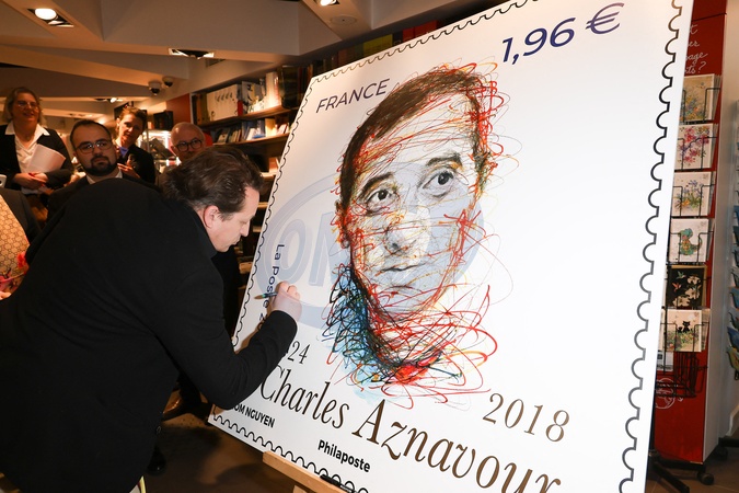 Exclusif - La Poste dévoile un timbre à l'effigie de Charles Aznavour à l'occasion du centenaire de la naissance de l'artiste, réalisé par le peintre Hom Nguyen au Carré d'encre à Paris