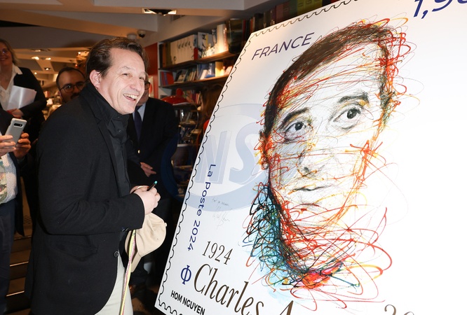 Exclusif - La Poste dévoile un timbre à l'effigie de Charles Aznavour à l'occasion du centenaire de la naissance de l'artiste, réalisé par le peintre Hom Nguyen au Carré d'encre à Paris
