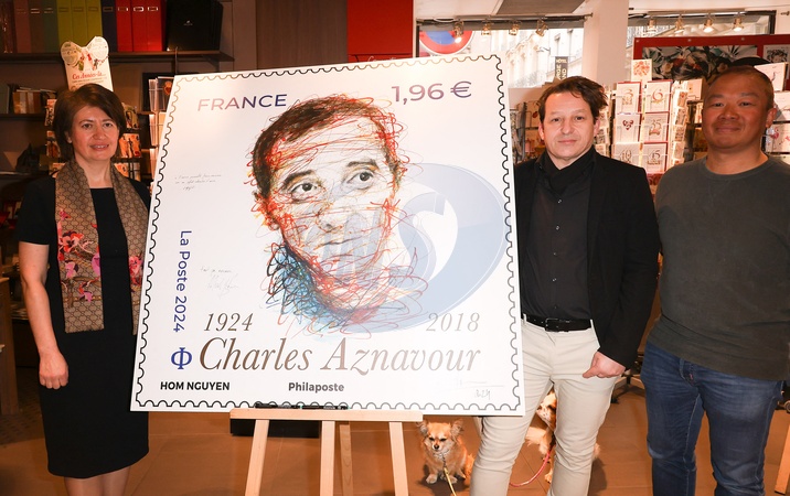 Exclusif - La Poste dévoile un timbre à l'effigie de Charles Aznavour à l'occasion du centenaire de la naissance de l'artiste, réalisé par le peintre Hom Nguyen au Carré d'encre à Paris