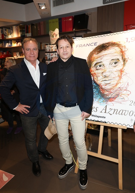 Exclusif - Fabien Lecœuvre et Mischa Aznavour - La Poste dévoile un timbre à l'effigie de Charles Aznavour à l'occasion du centenaire de la naissance de l'artiste, réalisé par le peintre Hom Nguyen au Carré d'encre à Paris le 27 février 2024. Le plus illustre représentant de la communauté arménienne de France, décédé en octobre 2018, sera représenté sur un timbre émis en avant-première au salon Paris-Philex 2024, à l'occasion du centenaire de sa naissance le 22 mai prochain. Le timbre, crée par H. Nguyen sera vendu en avant-première du jeudi 30 mai au samedi 1er juin lors de ce salon qui se tiendra Porte de Versailles à Paris. Tiré à plus de 600 000 exemplaires, il sera ensuite disponible à partir du 3 juin 2024 dans certains bureaux de poste par abonnement ou par correspondance. © Coadic Guirec/Bestimage Exclusive - For Germany call for price - No Web For Belgium and Switzerland - La Poste unveils a stamp bearing the effigy of Charles Aznavour on the occasion of the centenary of the artist's birth, produced by the painter Hom Nguyen at Carré d'encre in Paris on February 27, 2024. The most illustrious representative of the Armenian community of France, who died in October 2018, will be represented on a stamp issued in preview at the Paris-Philex 2024 fair, on the occasion of the centenary of his birth on May 22. The stamp, created by H. Nguyen, will be sold in preview from Thursday May 30 to Saturday June 1 during this show which will be held at Porte de Versailles in Paris. With a print run of more than 600,000 copies, it will then be available from June 3, 2024 in certain post offices by subscription or by mail.