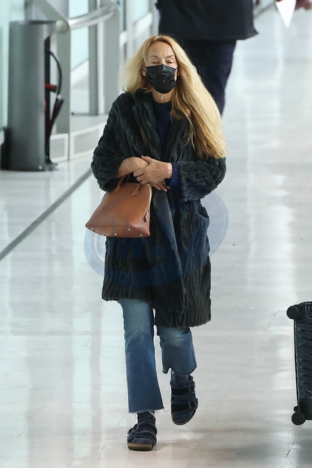 Exclusif - Jerry Hall arrive à l'aéroport de Paris-Charles de Gaulle (CDG) lors de la semaine de la mode femme automne/hiver 2024-2025 (PFW) à Paris le 28 février 2024. Exclusive -For Germany call for price - Jerry Hall arrives at Paris-Charles de Gaulle Airport (CDG) during Women's Fashion Week Fall/Winter 2024-2025 (PFW) in Paris on February 28, 2024.