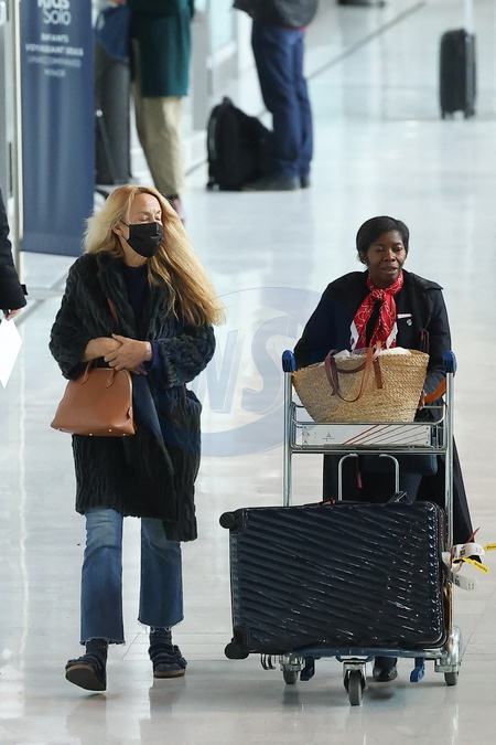 Exclusif - Jerry Hall arrive à l'aéroport de Paris-Charles de Gaulle (CDG) lors de la semaine de la mode femme automne/hiver 2024-2025 (PFW) à Paris le 28 février 2024. Exclusive -For Germany call for price - Jerry Hall arrives at Paris-Charles de Gaulle Airport (CDG) during Women's Fashion Week Fall/Winter 2024-2025 (PFW) in Paris on February 28, 2024.