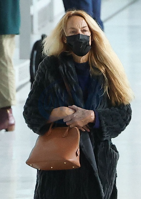 Exclusif - Jerry Hall arrive à l'aéroport de Paris-Charles de Gaulle (CDG) lors de la semaine de la mode femme automne/hiver 2024-2025 (PFW) à Paris le 28 février 2024. Exclusive -For Germany call for price - Jerry Hall arrives at Paris-Charles de Gaulle Airport (CDG) during Women's Fashion Week Fall/Winter 2024-2025 (PFW) in Paris on February 28, 2024.