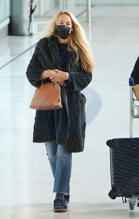 Exclusif - Jerry Hall arrive à l'aéroport de Paris-Charles de Gaulle (CDG) lors de la semaine de la mode femme automne/hiver 2024-2025 (PFW) à Paris le 28 février 2024. Exclusive -For Germany call for price - Jerry Hall arrives at Paris-Charles de Gaulle Airport (CDG) during Women's Fashion Week Fall/Winter 2024-2025 (PFW) in Paris on February 28, 2024.
