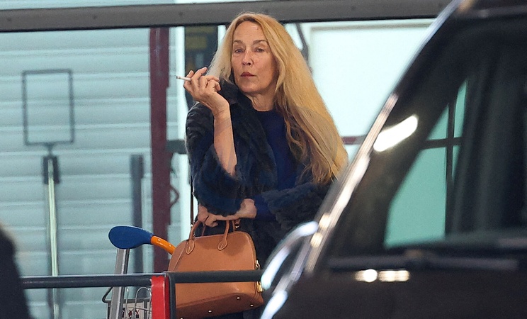Exclusif - Jerry Hall arrive à l'aéroport de Paris-Charles de Gaulle (CDG) lors de la semaine de la mode femme automne/hiver 2024-2025 (PFW) à Paris le 28 février 2024. Exclusive -For Germany call for price - Jerry Hall arrives at Paris-Charles de Gaulle Airport (CDG) during Women's Fashion Week Fall/Winter 2024-2025 (PFW) in Paris on February 28, 2024.