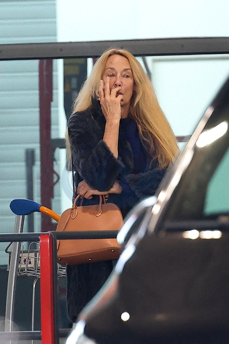 Exclusif - Jerry Hall arrive à l'aéroport de Paris-Charles de Gaulle (CDG) lors de la semaine de la mode femme automne/hiver 2024-2025 (PFW) à Paris le 28 février 2024. Exclusive -For Germany call for price - Jerry Hall arrives at Paris-Charles de Gaulle Airport (CDG) during Women's Fashion Week Fall/Winter 2024-2025 (PFW) in Paris on February 28, 2024.
