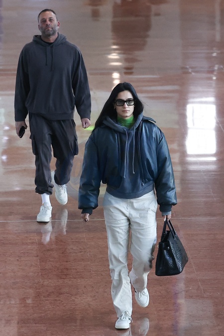 Isabela Grutman i jej mąż David przylatują na lotnisko Paryż-Charles de Gaulle (CDG) podczas Tygodnia Mody Damskiej Jesień/Zima 2024–2025 (PFW) w Paryżu
