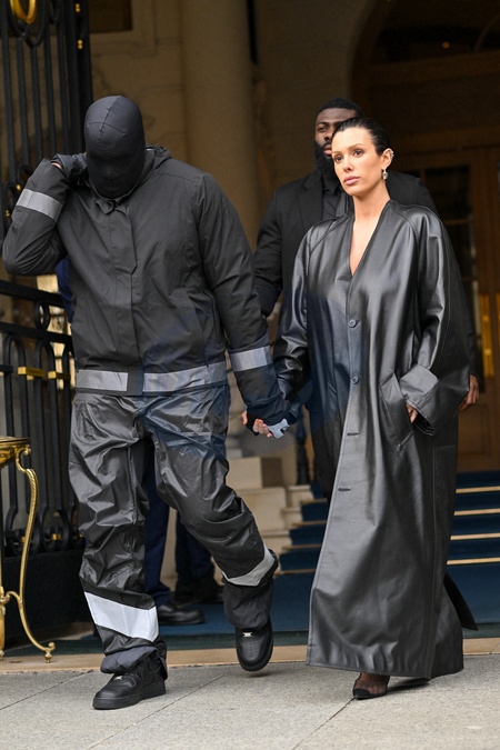 Kanye West (Ye) et sa femme Bianca Censori à la sortie de l'hôtel Ritz lors de la semaine de la mode femme automne/hiver 2024-2025 (PFW)