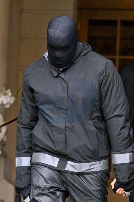 Kanye West (Ye) et sa femme Bianca Censori à la sortie de l'hôtel Ritz lors de la semaine de la mode femme automne/hiver 2024-2025 (PFW), à Paris, France, le 28 février 2024. Il s'est affublé de son look désormais classique : cagoule intégrale, blouson noir et et chaussures noires. Kanye West (Ye) and his wife Bianca Censori at the exit of the Ritz hotel during the Fashion Week Fall/Winter 2024-2025 (PFW), in Paris, France, on February 28, 2024.