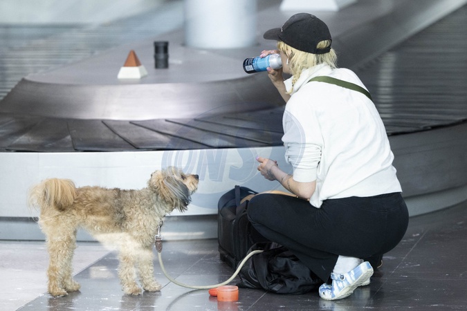 Agathe Rousselle w towarzystwie psa przybywa na lotnisko Paryż-Charles de Gaulle (CDG) podczas tygodnia mody damskiej jesień/zima 2024–2025