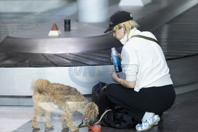 Exclusif - Agathe Rousselle accompagnée de son chien, arrive à l'aéroport de Paris-Charles de Gaulle (CDG) lors de la semaine de la mode femme automne/hiver 2024-2025 (PFW)