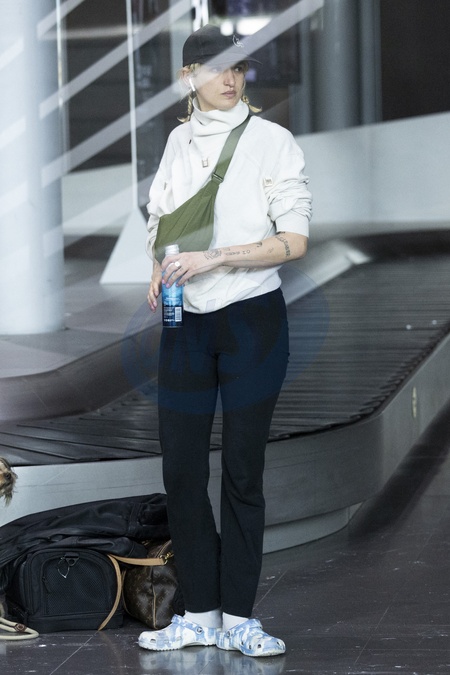 Exclusif - Agathe Rousselle accompagnée de son chien, arrive à l'aéroport de Paris-Charles de Gaulle (CDG) lors de la semaine de la mode femme automne/hiver 2024-2025 (PFW), à Roissy-en-France, France, le 28 février 2024. Exclusive - For Germany Call For Price - Winnie Harlow arrives at Paris-Charles de Gaulle Airport (CDG) during the Fashion Week Fall/Winter 2024-2025 (PFW), in Roissy-en-France, France, on February 28, 2024.