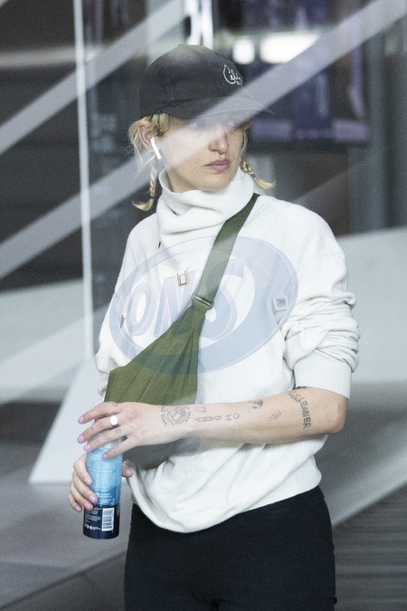 Exclusif - Agathe Rousselle accompagnée de son chien, arrive à l'aéroport de Paris-Charles de Gaulle (CDG) lors de la semaine de la mode femme automne/hiver 2024-2025 (PFW)