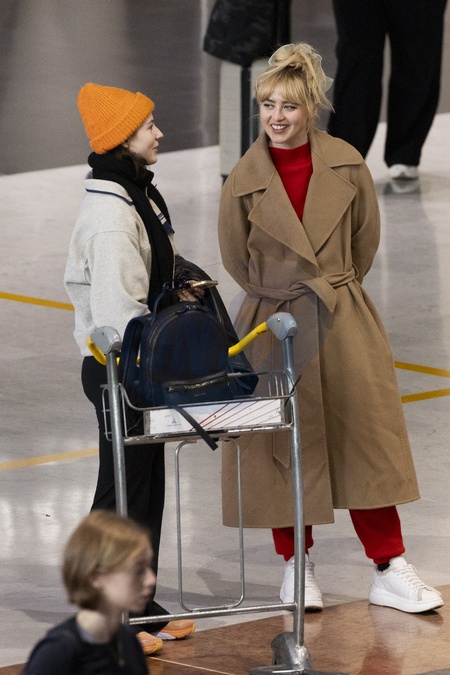 Exclusif - Kathryn Newton et Thomasin McKenzie se croisent et discutent à l'aéroport de Paris-Charles de Gaulle (CDG) lors de la semaine de la mode femme automne/hiver 2024-2025 (PFW)