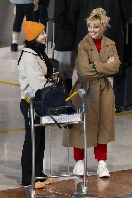 Exclusif - Kathryn Newton et Thomasin McKenzie se croisent et discutent à l'aéroport de Paris-Charles de Gaulle (CDG) lors de la semaine de la mode femme automne/hiver 2024-2025 (PFW)