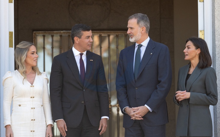 Le roi Felipe VI et la reine Letizia d’Espagne lors de la réception avec le président du Paraguay Santiago Pena et sa femme Leticia Ocampos au palais de la Zarzuela à Madrid