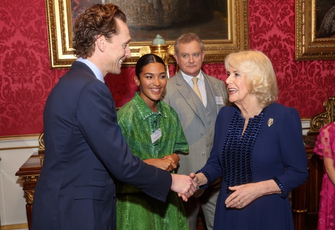 Queen Camilla shakes hands with Tom Hiddleston during a reception for the BBC's 500 Words Finalists at Buckingham Palace on February 28, 2024 in London, England. NO UK USE FOR 48 HOURS, Credit:Avalon.red / Avalon