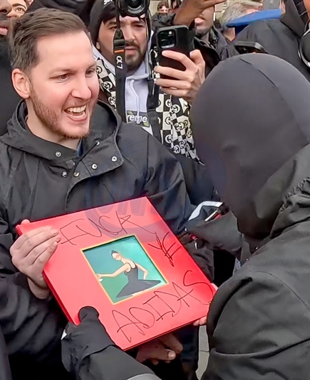 Exclusif - Kanye West (Ye) et sa femme Bianca Censori à la sortie de l'hôtel Ritz lors de la semaine de la mode femme automne/hiver 2024-2025 (PFW), à Paris, France, le 28 février 2024. En sortant, les fans et les photographes ont commencé à chanter "f ck adidas '' et Kanye signe une copie de son album" My Beautiful Dark Twisted Fantasy "avec les mots: FUCK ADIDAS. Ye s'est affublé de son look désormais classique : cagoule intégrale, blouson noir et et chaussures noires. EXCLUSIVE - Ye and Bianca Censori exit The Ritz Paris and head out for lunch during PFW. On their way out, fans and photographers began chanting "FCK ADIDAS'' and the couple was pleased with the show of support with Bianca smiling approvingly and Kanye signing a copy of his album 'My Beautiful Dark Twisted Fantasy' with the words: FUCK ADIDAS.