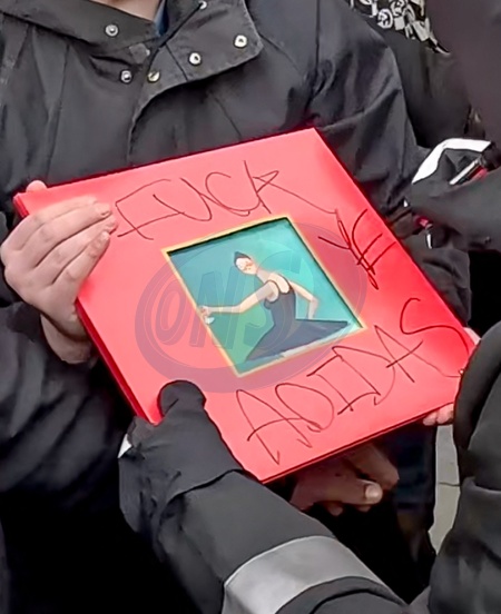 Exclusif - Kanye West (Ye) et sa femme Bianca Censori à la sortie de l'hôtel Ritz lors de la semaine de la mode femme automne/hiver 2024-2025 (PFW), à Paris, France, le 28 février 2024. En sortant, les fans et les photographes ont commencé à chanter "f ck adidas '' et Kanye signe une copie de son album" My Beautiful Dark Twisted Fantasy "avec les mots: FUCK ADIDAS. Ye s'est affublé de son look désormais classique : cagoule intégrale, blouson noir et et chaussures noires. EXCLUSIVE - Ye and Bianca Censori exit The Ritz Paris and head out for lunch during PFW. On their way out, fans and photographers began chanting "FCK ADIDAS'' and the couple was pleased with the show of support with Bianca smiling approvingly and Kanye signing a copy of his album 'My Beautiful Dark Twisted Fantasy' with the words: FUCK ADIDAS.