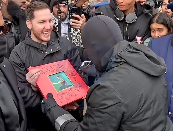 Exclusif - Kanye West (Ye) et sa femme Bianca Censori à la sortie de l'hôtel Ritz lors de la semaine de la mode femme automne/hiver 2024-2025 (PFW), à Paris, France, le 28 février 2024. En sortant, les fans et les photographes ont commencé à chanter "f ck adidas '' et Kanye signe une copie de son album" My Beautiful Dark Twisted Fantasy "avec les mots: FUCK ADIDAS. Ye s'est affublé de son look désormais classique : cagoule intégrale, blouson noir et et chaussures noires. EXCLUSIVE - Ye and Bianca Censori exit The Ritz Paris and head out for lunch during PFW. On their way out, fans and photographers began chanting "FCK ADIDAS'' and the couple was pleased with the show of support with Bianca smiling approvingly and Kanye signing a copy of his album 'My Beautiful Dark Twisted Fantasy' with the words: FUCK ADIDAS.