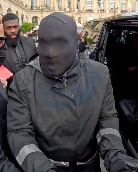 Exclusif - Kanye West (Ye) et sa femme Bianca Censori à la sortie de l'hôtel Ritz lors de la semaine de la mode femme automne/hiver 2024-2025 (PFW), à Paris, France, le 28 février 2024. En sortant, les fans et les photographes ont commencé à chanter "f ck adidas '' et Kanye signe une copie de son album" My Beautiful Dark Twisted Fantasy "avec les mots: FUCK ADIDAS. Ye s'est affublé de son look désormais classique : cagoule intégrale, blouson noir et et chaussures noires. EXCLUSIVE - Ye and Bianca Censori exit The Ritz Paris and head out for lunch during PFW. On their way out, fans and photographers began chanting "FCK ADIDAS'' and the couple was pleased with the show of support with Bianca smiling approvingly and Kanye signing a copy of his album 'My Beautiful Dark Twisted Fantasy' with the words: FUCK ADIDAS.