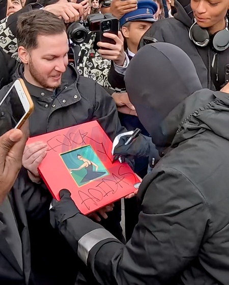 Exclusif - Kanye West (Ye) et sa femme Bianca Censori à la sortie de l'hôtel Ritz lors de la semaine de la mode femme automne/hiver 2024-2025 (PFW), à Paris, France, le 28 février 2024. En sortant, les fans et les photographes ont commencé à chanter "f ck adidas '' et Kanye signe une copie de son album" My Beautiful Dark Twisted Fantasy "avec les mots: FUCK ADIDAS. Ye s'est affublé de son look désormais classique : cagoule intégrale, blouson noir et et chaussures noires. EXCLUSIVE - Ye and Bianca Censori exit The Ritz Paris and head out for lunch during PFW. On their way out, fans and photographers began chanting "FCK ADIDAS'' and the couple was pleased with the show of support with Bianca smiling approvingly and Kanye signing a copy of his album 'My Beautiful Dark Twisted Fantasy' with the words: FUCK ADIDAS.