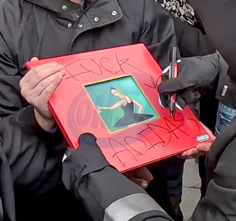 Exclusif - Kanye West (Ye) et sa femme Bianca Censori à la sortie de l'hôtel Ritz lors de la semaine de la mode femme automne/hiver 2024-2025 (PFW), à Paris, France, le 28 février 2024. En sortant, les fans et les photographes ont commencé à chanter "f ck adidas '' et Kanye signe une copie de son album" My Beautiful Dark Twisted Fantasy "avec les mots: FUCK ADIDAS. Ye s'est affublé de son look désormais classique : cagoule intégrale, blouson noir et et chaussures noires. EXCLUSIVE - Ye and Bianca Censori exit The Ritz Paris and head out for lunch during PFW. On their way out, fans and photographers began chanting "FCK ADIDAS'' and the couple was pleased with the show of support with Bianca smiling approvingly and Kanye signing a copy of his album 'My Beautiful Dark Twisted Fantasy' with the words: FUCK ADIDAS.