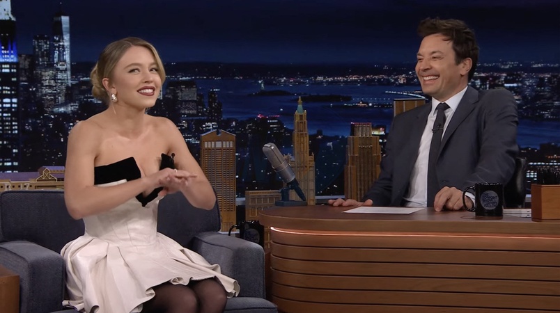 Sydney Sweeney na planie programu „Tonight Show” Jimmy’ego Fallona w Nowym Jorku