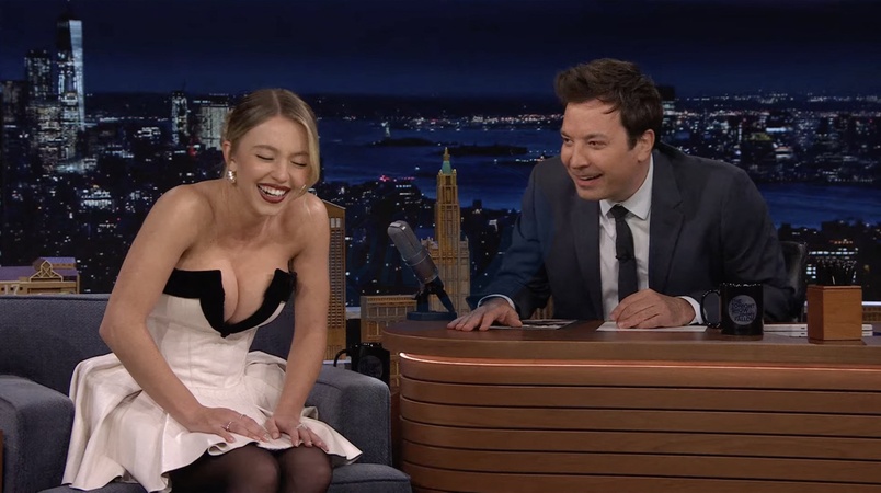 Sydney Sweeney na planie programu „Tonight Show” Jimmy’ego Fallona w Nowym Jorku