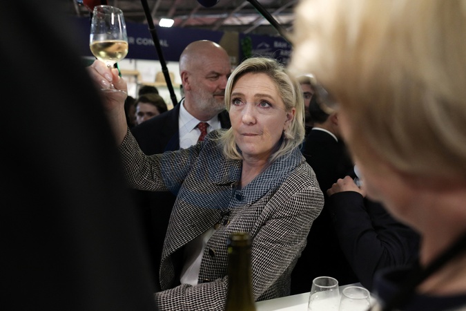 Marine Le Pen, présidente du groupe Rassemblement National à l'Assemblée nationale boit un verre de vin blanc lors de la 60ème édition du Salon international de l'Agriculture (SIA), Porte de Versailles, Paris, le 27 février 2024 © Stéphane Lemouton / Bestimage France, Paris, February 28 2024. Marine Le Pen (Rassemblement National) visits the Agricultural Fair, using selfies as a communication tool. Photograph
