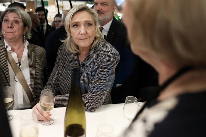 Marine Le Pen, présidente du groupe Rassemblement National à l'Assemblée nationale boit un verre de vin blanc lors de la 60ème édition du Salon international de l'Agriculture (SIA), Porte de Versailles, Paris, le 27 février 2024 © Stéphane Lemouton / Bestimage France, Paris, February 28 2024. Marine Le Pen (Rassemblement National) visits the Agricultural Fair, using selfies as a communication tool. Photograph