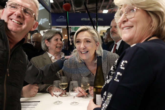 Marine Le Pen, présidente du groupe Rassemblement National à l'Assemblée nationale boit un verre de vin blanc lors de la 60ème édition du Salon international de l'Agriculture (SIA), Porte de Versailles, Paris, le 27 février 2024 © Stéphane Lemouton / Bestimage France, Paris, February 28 2024. Marine Le Pen (Rassemblement National) visits the Agricultural Fair, using selfies as a communication tool. Photograph