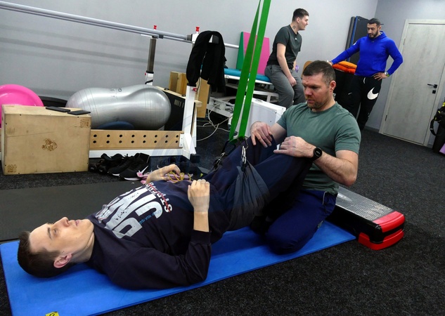 ODESA, UKRAINE - FEBRUARY 26, 2024 - A physical therapist attends to a serviceman who sustained injuries on the front line during a free rehabilitation session in a physical therapy gym at a fitness club in Odesa, southern Ukraine., Credit:Yulii Zozulia / Avalon