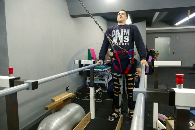 ODESA, UKRAINE - FEBRUARY 26, 2024 - A serviceman who sustained injuries on the front line exercises of a treadmill during a free rehabilitation session in a physical therapy gym at a fitness club in Odesa, southern Ukraine., Credit:Yulii Zozulia / Avalon